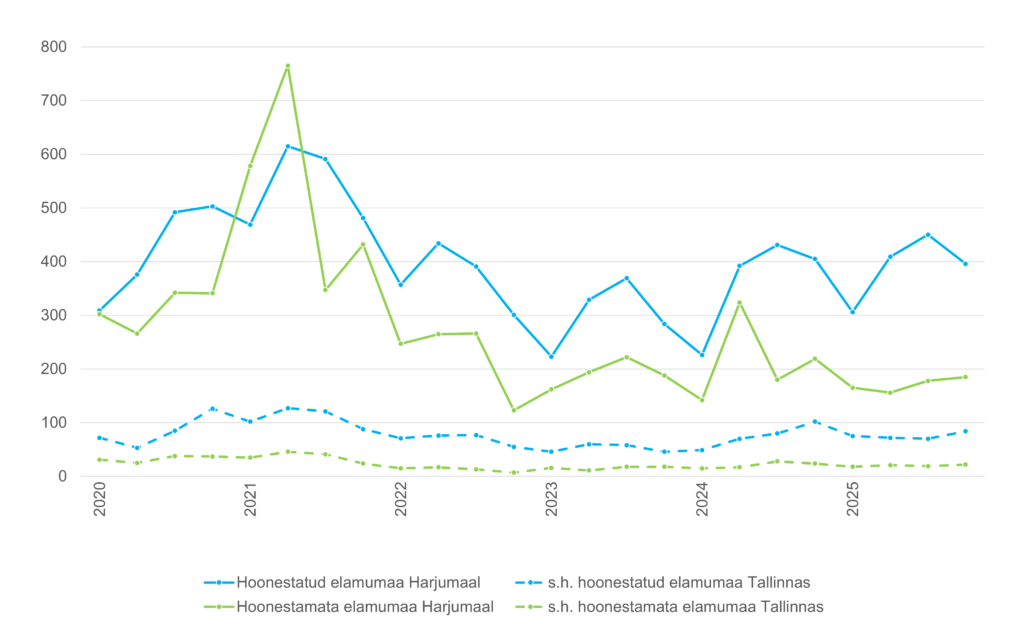 2025 aastal kokku tehti Harjumaal 1561 hoonestatud elamumaa tehingut, mis ületab aastat 2024 rohkem kui 100 võrra. Seega on elamute turg samuti suhteliselt aktiivne.