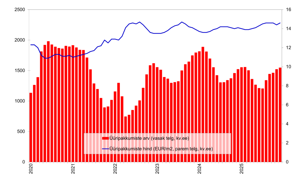 Üürikorterite pakkumiste arv, mis aasta alguse oli kv.ee andmetel oli üle 1500 langes suvel ~1200-ni tõusis uuesti ja jõudis detsembris ~1550-ni. Keskmine pakkumishind on aasta alguse ~14 EUR/m2-lt tõusnud 14,6 EUR/m2 -le.